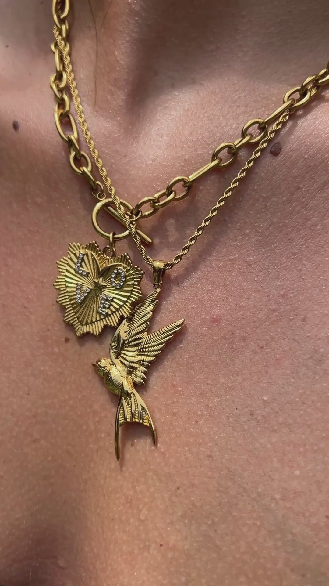 Radiant heart shaped pendant etched with sunburst rays and adorned zircon studded LOVE. The symbol at the crest of the heart is a dove for peace, hope and enduring affection. Suspended from a chunky vintage-style gold chain with classic fob fastening, blending romance and statement making edge. Perfect for lovers of heirloom charm and modern bohemia