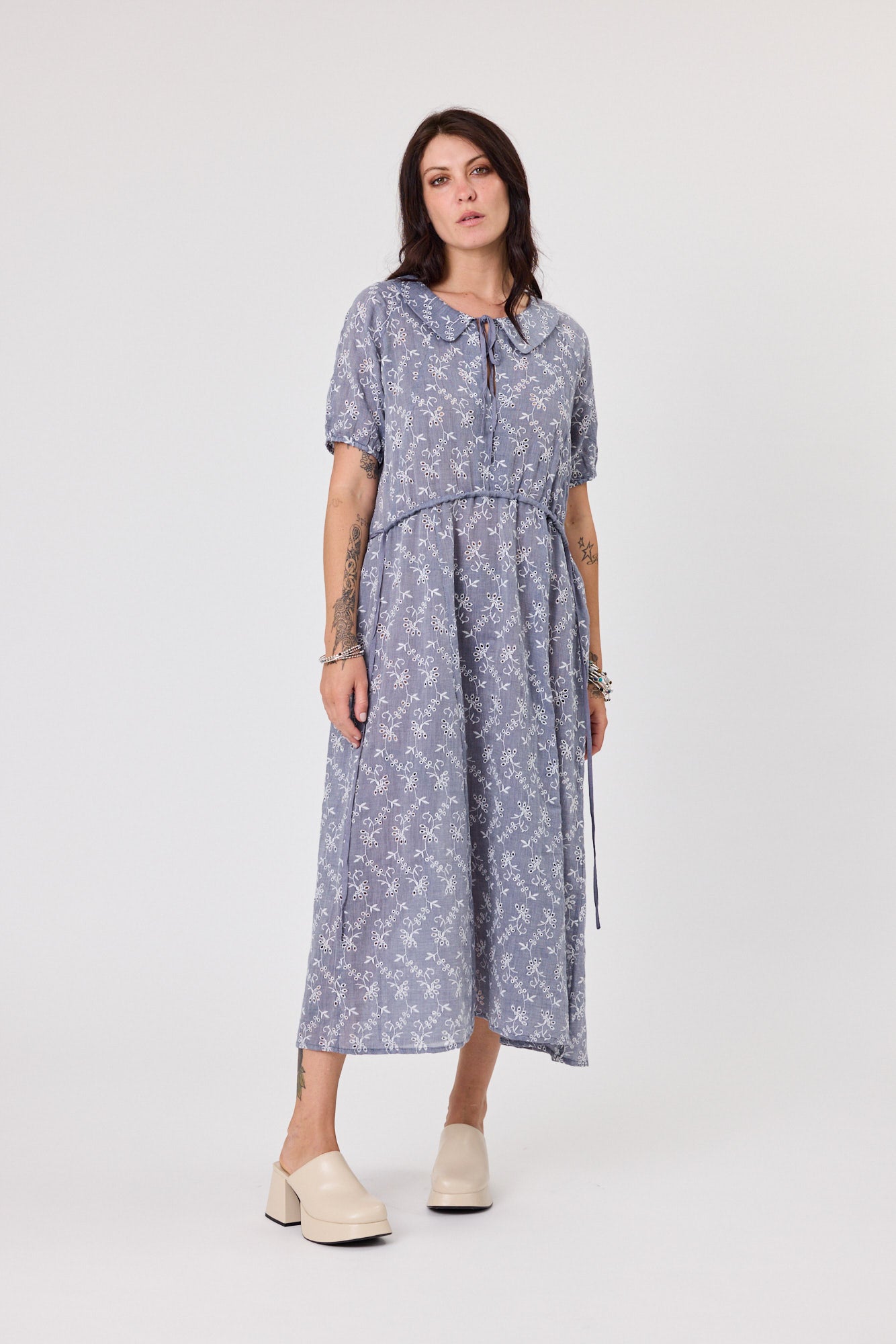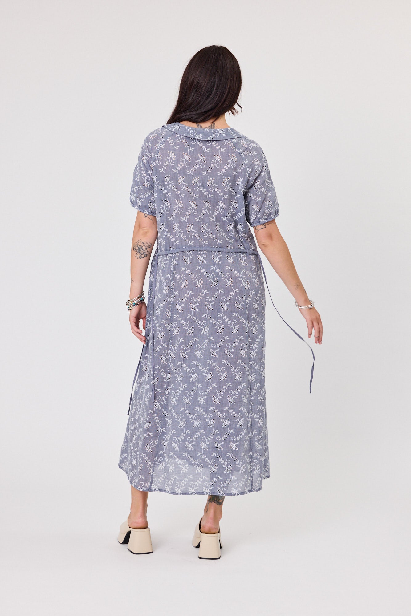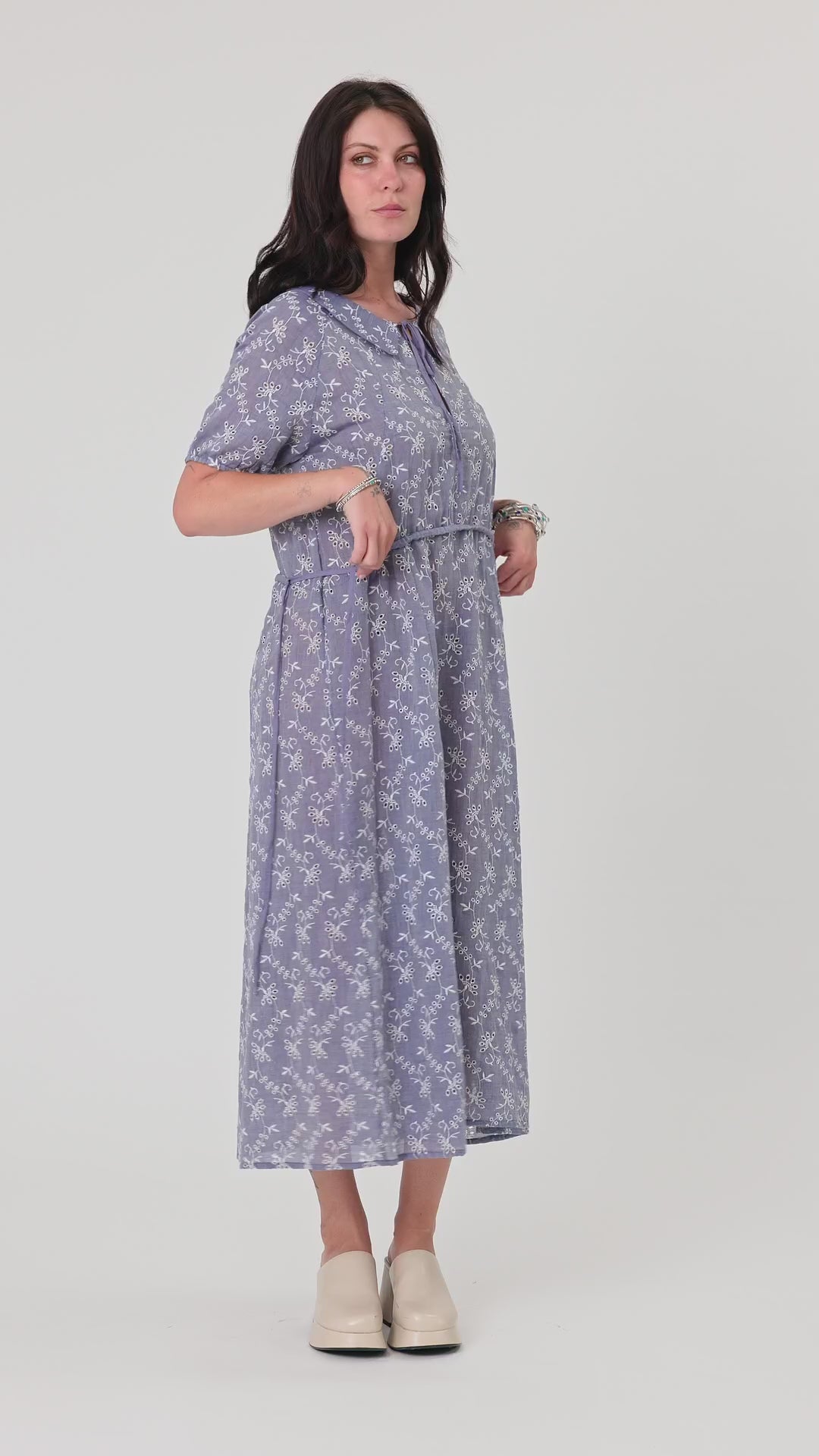 The Details: Relaxed midi dress in rich indigo cotton featuring delicate white floral embroidery throughout. The soft cotton drapes beautifully while the intricate embroidery adds artisanal luxury.
