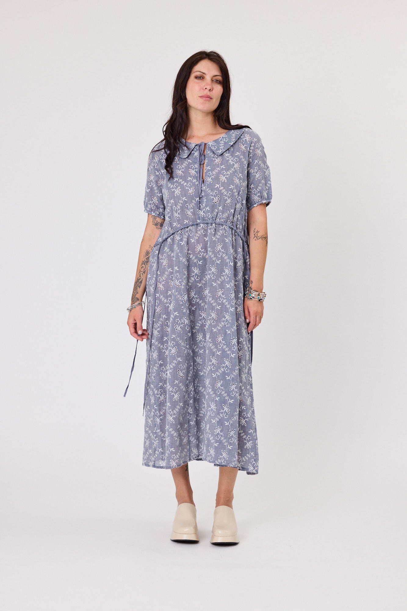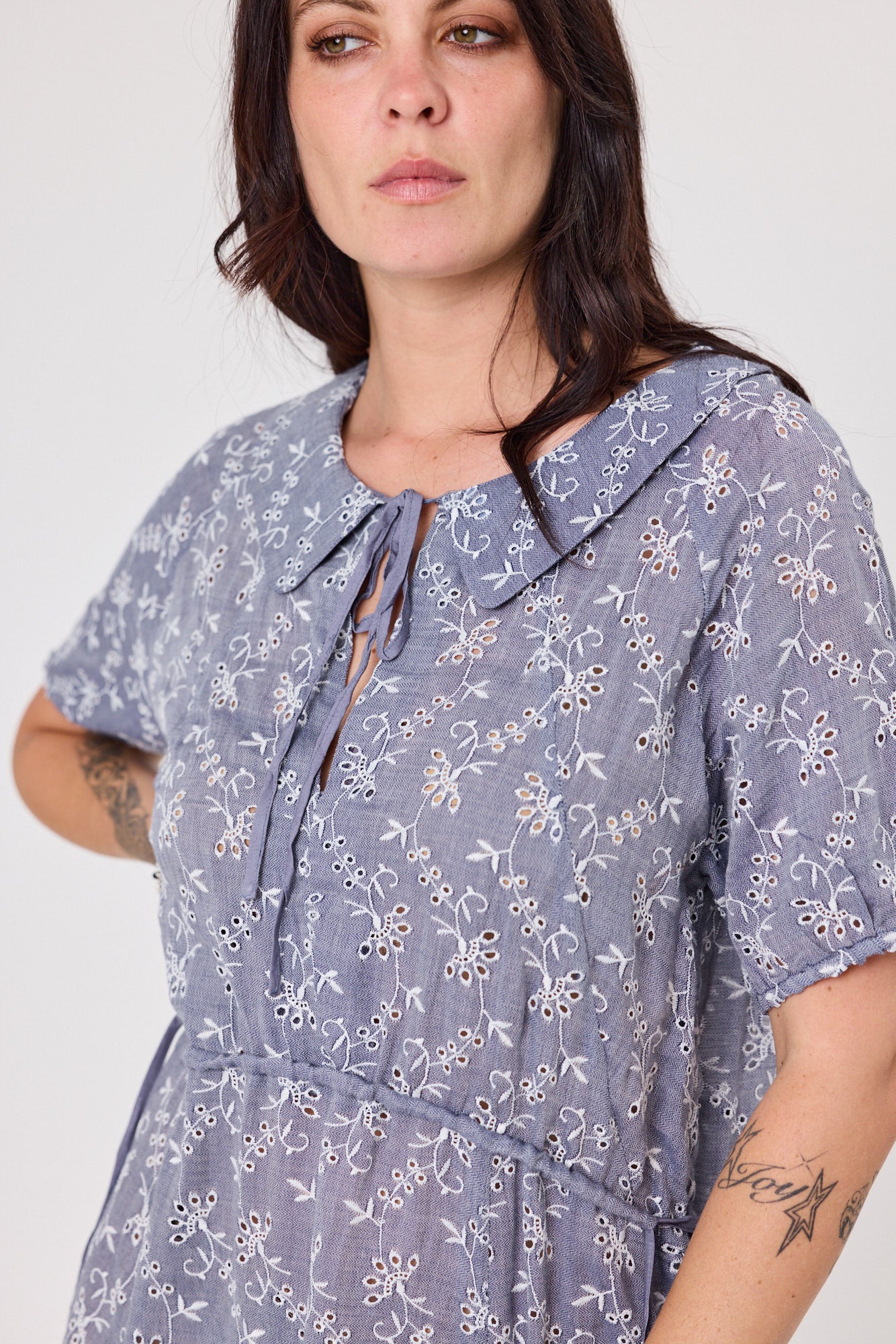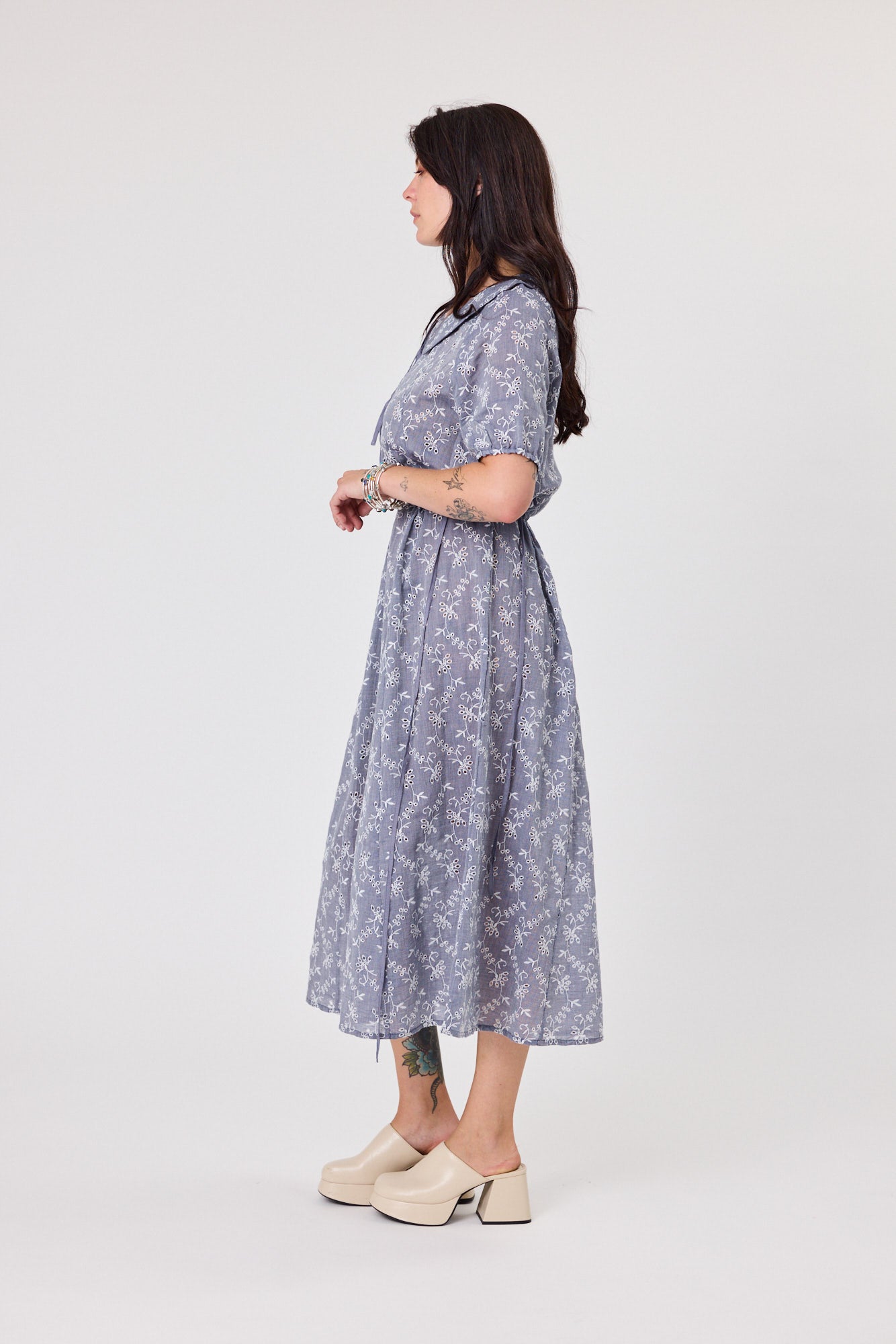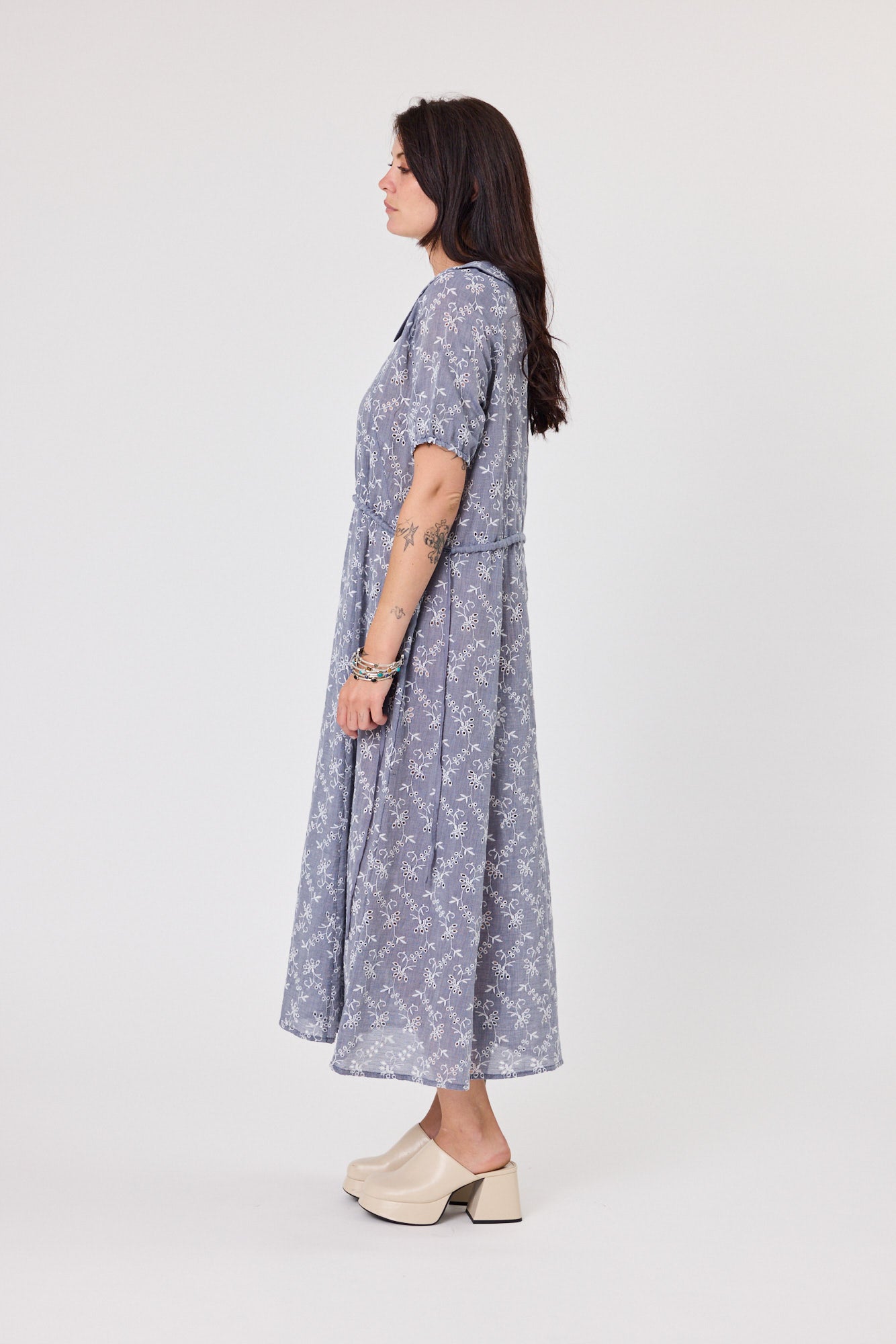 The Details: Relaxed midi dress in rich indigo cotton featuring delicate white floral embroidery throughout. The soft cotton drapes beautifully while the intricate embroidery adds artisanal luxury.