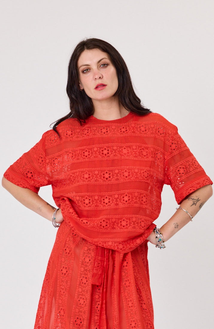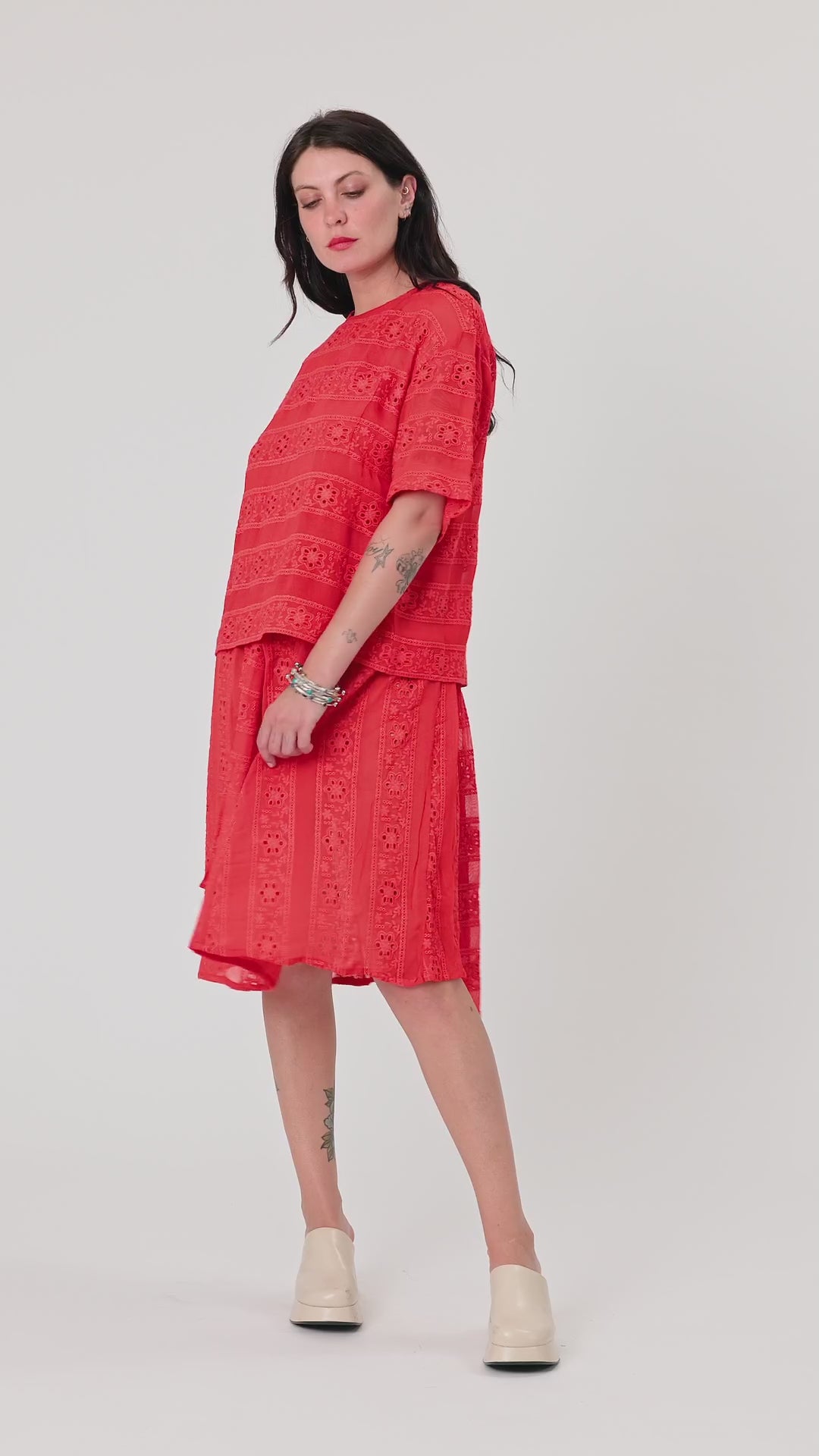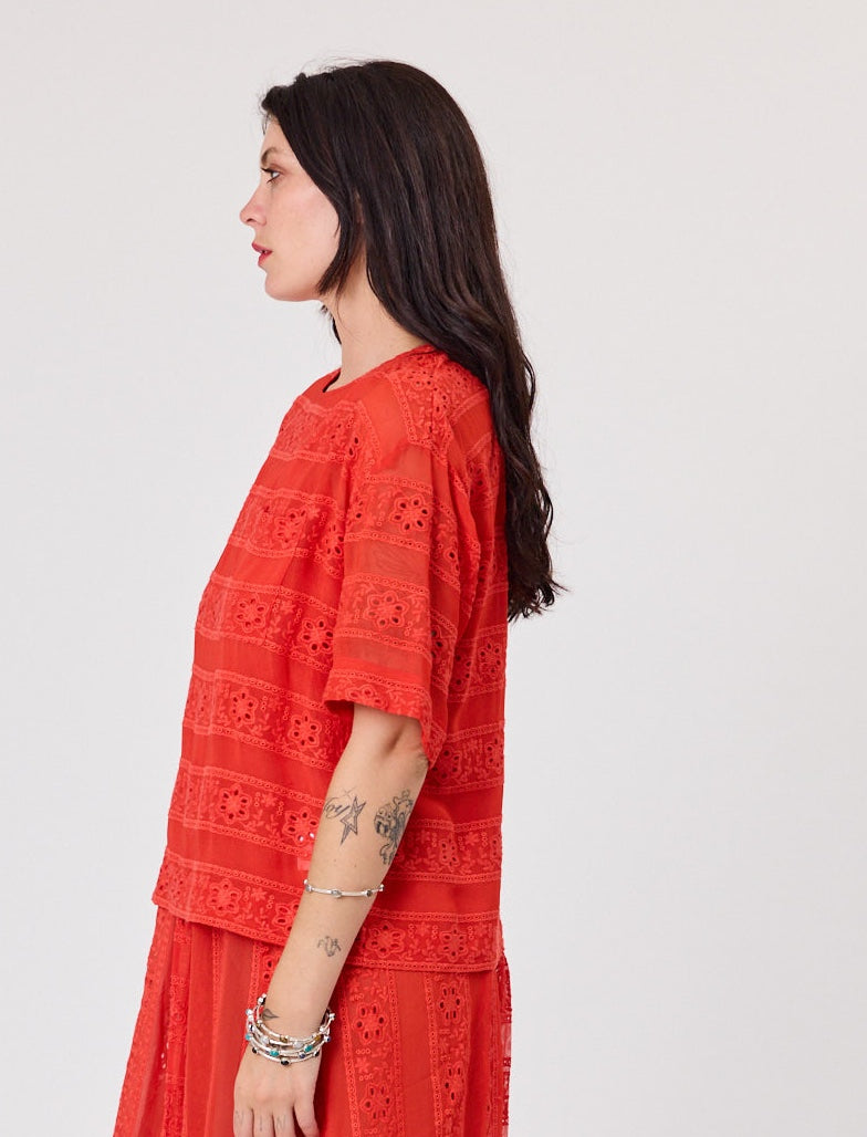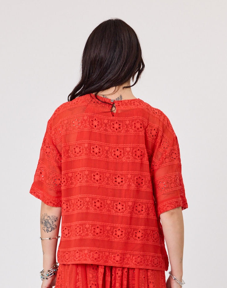 The Details: Short-sleeved top in emerald green or strawberry embroidered viscose. The fluid viscose drapes beautifully and feels luxurious against skin. Cute button back neck.